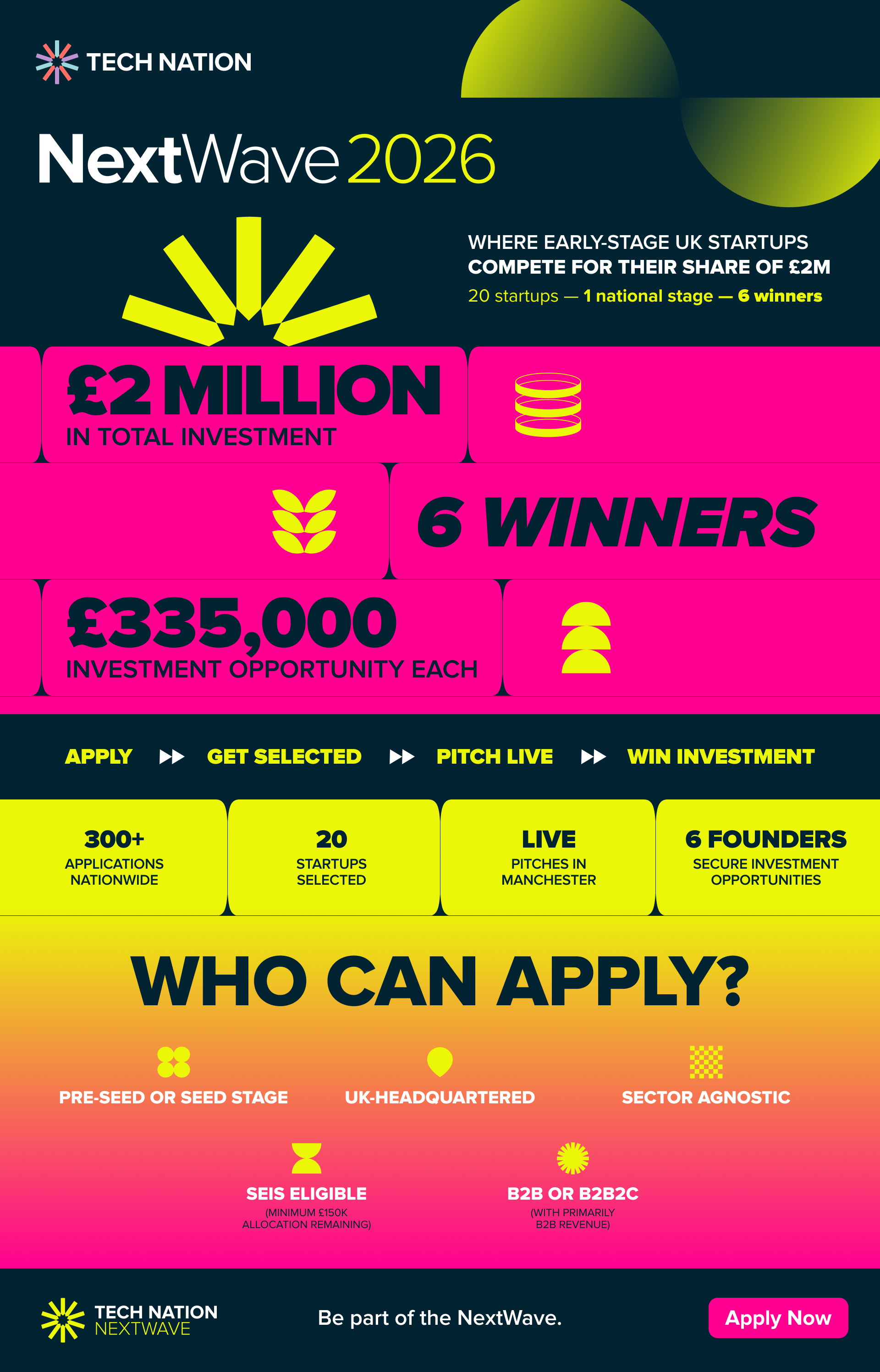 20 startups will be selected from hundreds of applications across the UK to pitch at the NextWave Final. At least six companies will receive investment opportunities of £335,000 each on the day.