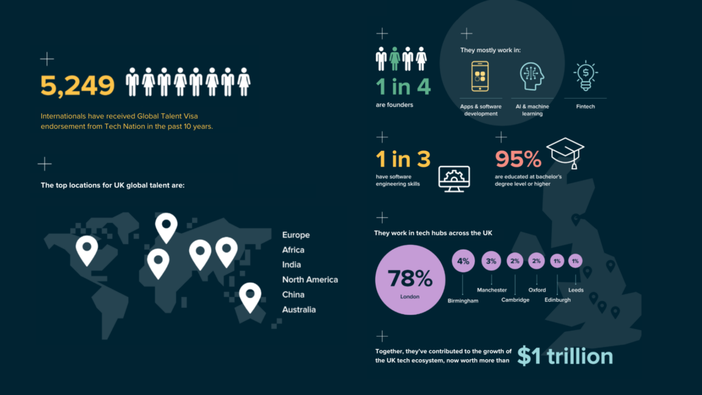 Tech Nation is the official Home Office designated endorsing body authorised to assess endorsement applications from individuals with expertise in digital technology and who want to come to the UK under the Global Talent Visa.Together Tech Nation Global Talent Visa Alumni have contributed to the growth of the UK tech ecosystem, now worth more than $1Trillion.